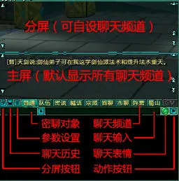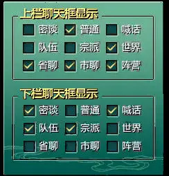 选择聊天框显示内容:左键点击聊天频道切换栏左边的“参数设置”按钮,可设置上下聊天框显示的聊天频道,再次点击将关闭“参数设置”界面。