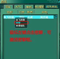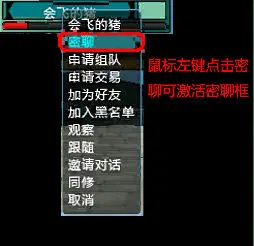 方法七:在聊天显示框,鼠标右击玩家名字,在弹出的快捷交互栏中选择“密聊”。