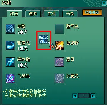 按“I“快速打开功能栏,鼠标左键点中已经学习到的技能,拖动放置到界面的技能快捷栏中,选中使用对象后,即可右键点击图标,或者按其对应的键盘快捷键使用该技能。
