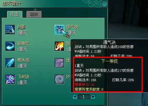 点击所要提升的技能图标,检查是否有足够的阵营贡献度、自身修为是否达到要求。