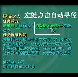 按“L”键打开任务面板,点击任务面板上的关键字(绿色),比如“初级法术使者”,即可自动行走到初级法术使者面前。