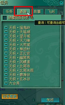 还是按“L”打开任务面板,点击“查询”可查询目前等级可接受但还未接受的任务,接任务NPC按照所在地图进行分类,例