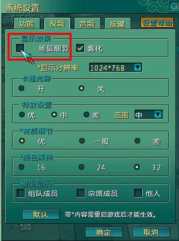 3、在系统设置里的视频选项中,勾掉关闭显示效果中的“场景细节”和“雾化”选项